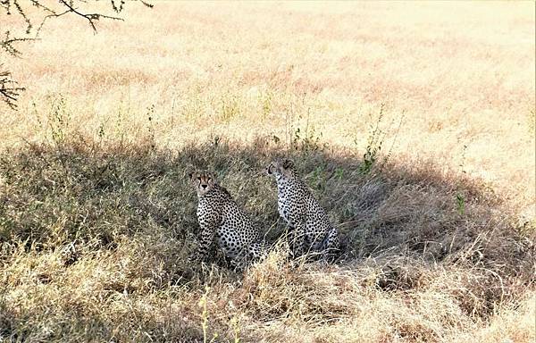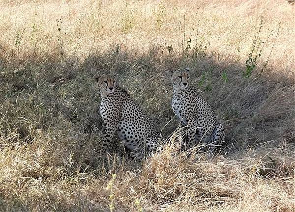 乘涼中的 獵豹 Cheetah ,臉上有兩條淚溝,花紋是黑色實心斑點。(下面的照片) 也有看到 花豹 Leopard ,臉上沒有淚溝,花紋是黑色空心斑,然後裡面有些咖啡色點點 我們看到的 時候都在樹上,比較遠拍不清楚 。![]()