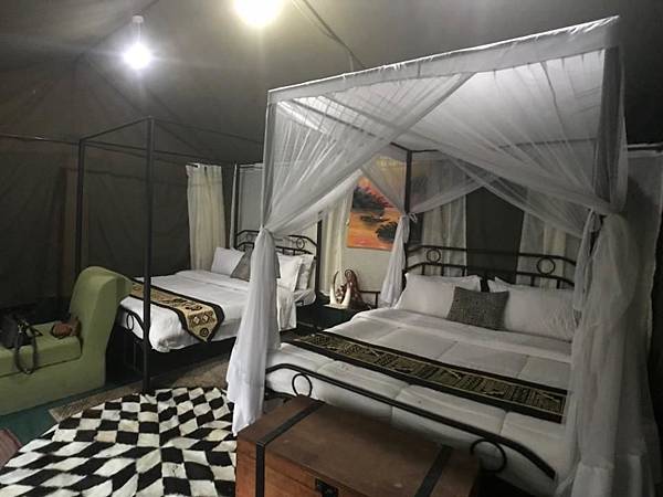 請注意晚上絕對不要私自出帳篷,一定要請工作人員來帶。白天時動物知道這邊有人不會輕易靠近,但是晚上他們會到處走動,我們半夜就有聽到好多種動物叫聲。同時間有個新聞是台灣人在肯亞被河馬攻擊死亡,輕忽的後果會很可怕。
