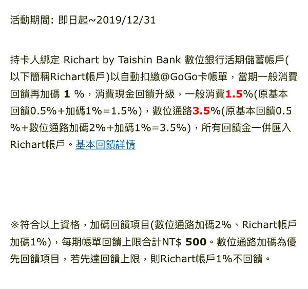- 搭配gogo信用卡網路消費還有最高3.5%的回饋(須用richart自動扣繳卡費、每月轉2萬到richart戶頭)(每月回饋上限500元)