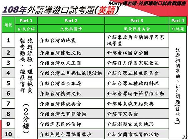 以上只是給大家一點想法,有太多太多主題和字彙了,留給大家努力查摟。畢竟準備不只是為了考試,而是要真正上工後能夠講解給外國人聽,沒有上知天文、下知地理、清楚人文歷史很容易當場被問倒,老是說不知道很尷尬而且也可能被客訴。